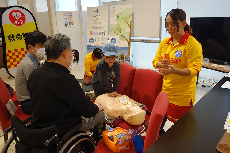 当日は9組11名の方にご参加いただき、愛知県ライフセービング協会所属のライフセーバーの方に、AEDの使い方や心肺蘇生法についてレクチャーしていただきました。四日市店では、職場などで一度AED講習を受けたことがあるという方が多くみえました。実際の場面を想定して、熱心に質問される方が多かったのが印象的でした。